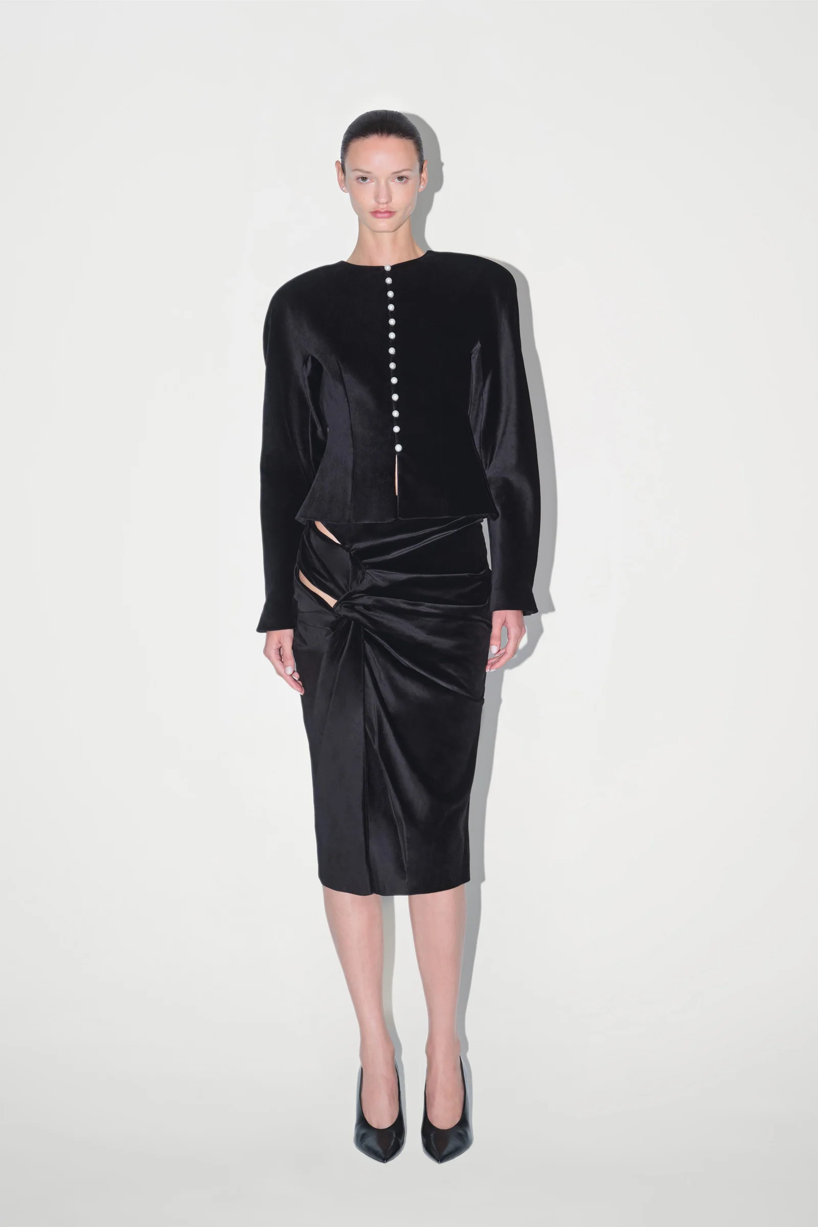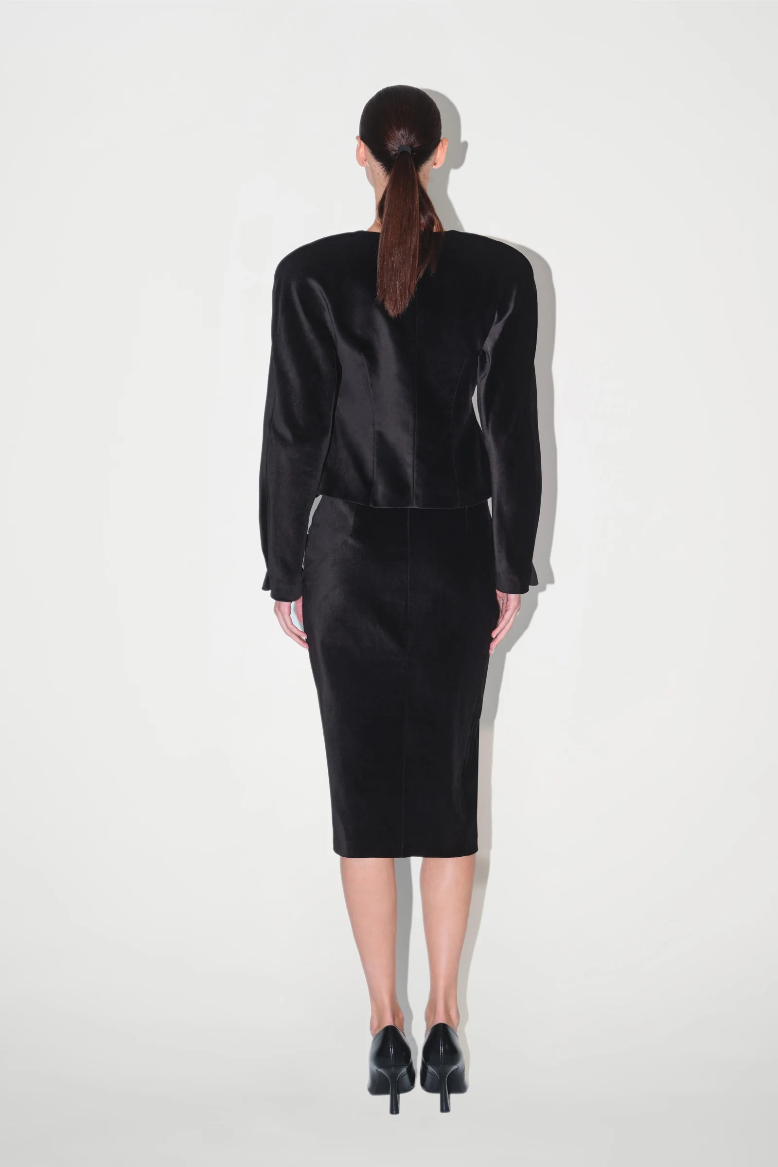 The Dusk Jacket is made from plush velvet and shaped with strong shoulders and a fitted waist, while pearl closures along the front add contrast to its deep texture.