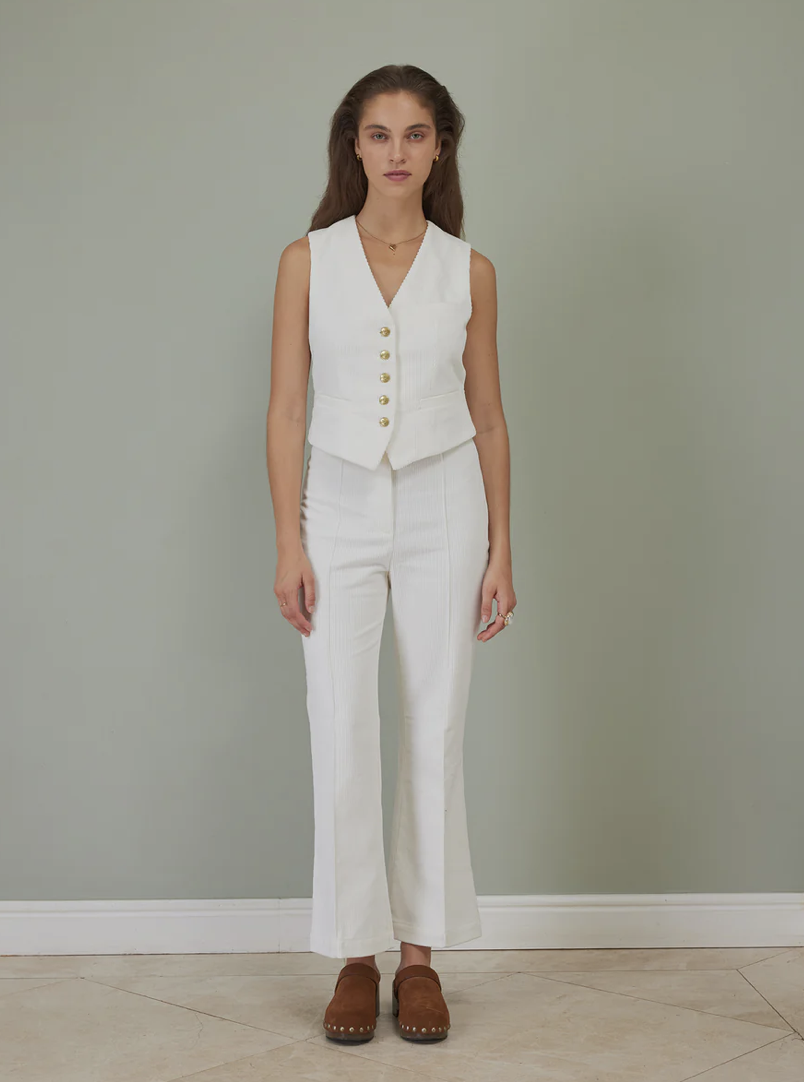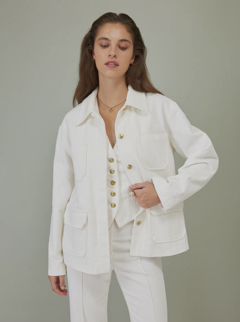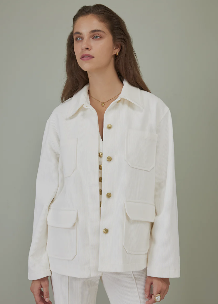 Winter whites are here! The Jaiyk in corduroy is our take on the utilitarian jacket. It comes with ample pocket space, a cotton lining and our cheetah logo metal buttons. It looks great worn with the Dagger Corduroy Pants and Vida Vest in the same color or simply worn over your denims.