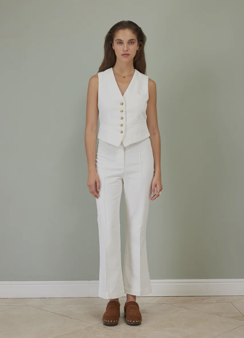 Winter whites are a favorite here! The Vida Corduroy Vest comes in a thick corduroy and looks great as part of a three piece look together with the Dagger Pants and Jay Jacket. We also love it with the wool Mount Ararat Cardigan in cream to keep warm.