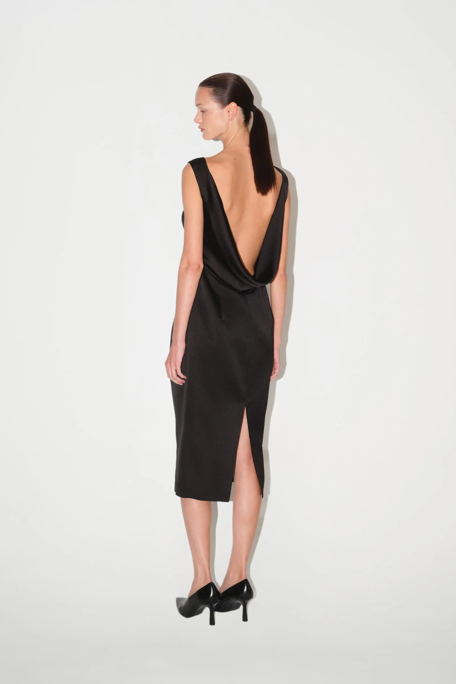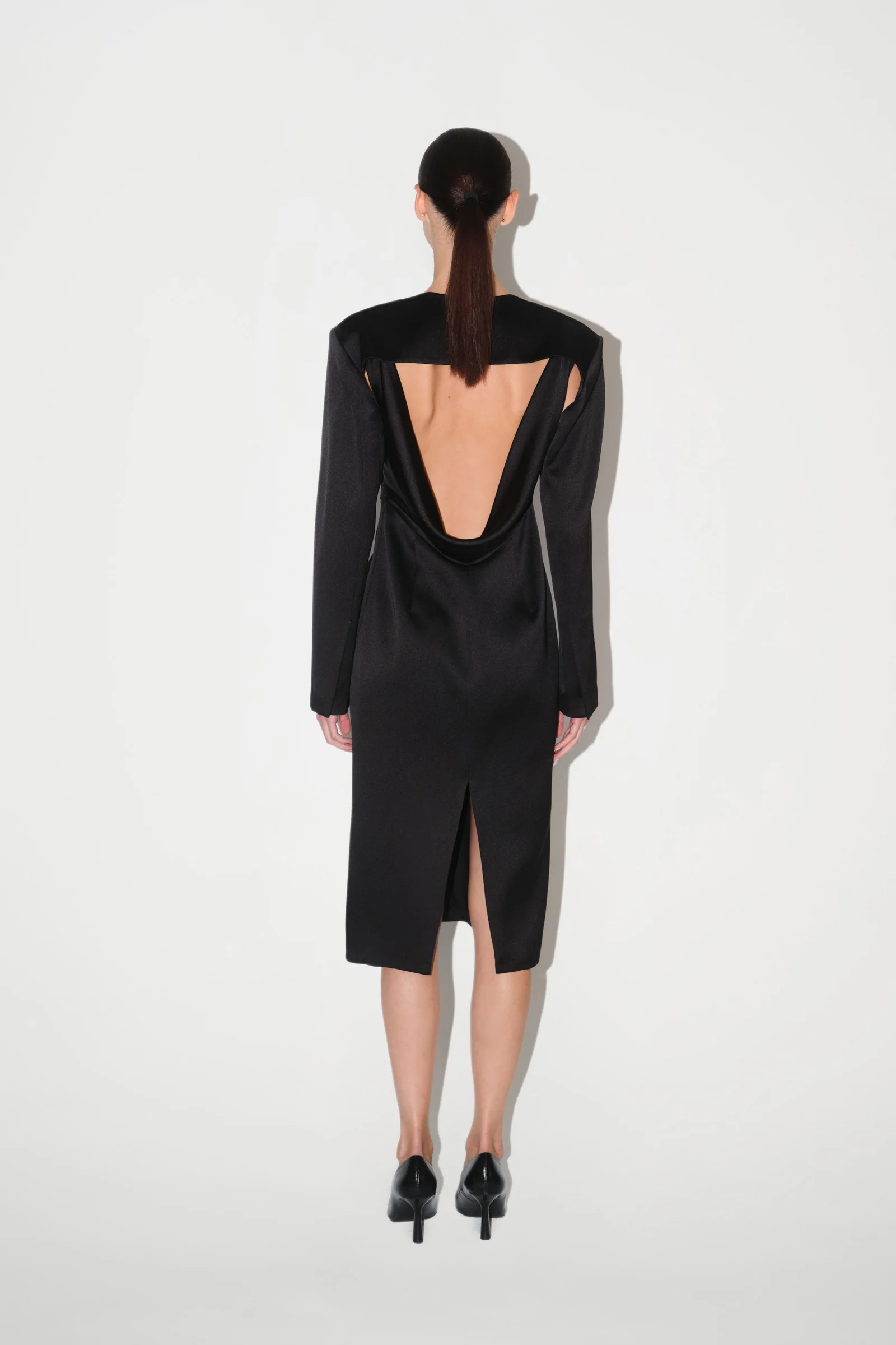The Midnight Dress balances structure and softness, featuring a refined silhouette complemented by a detachable bolero that adds sculptural depth to its minimalist form.