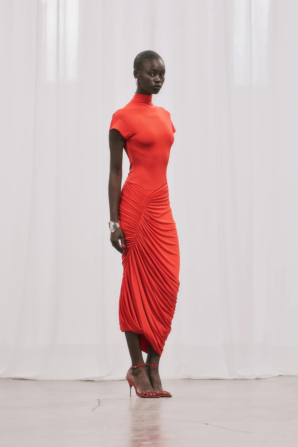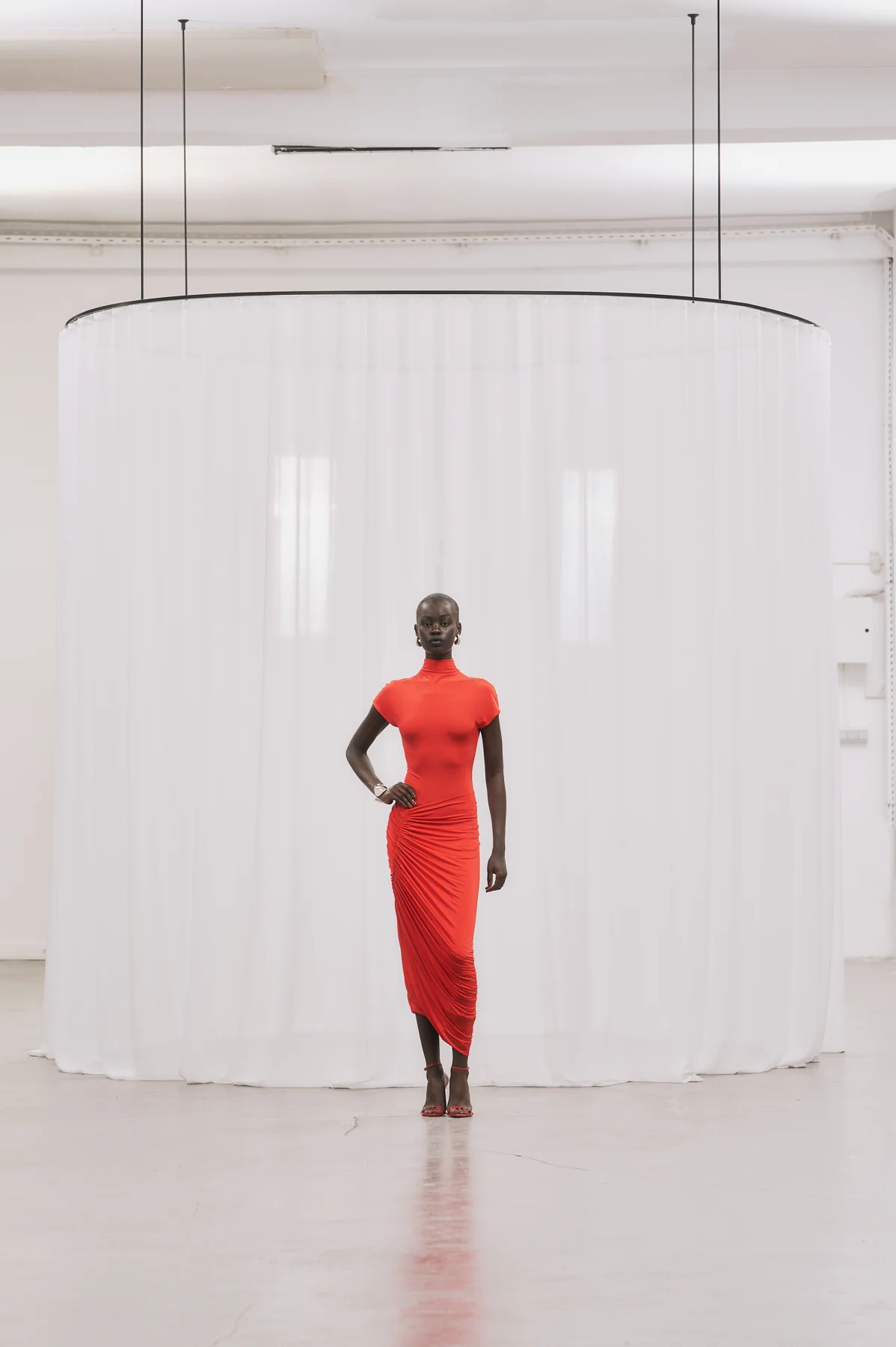 This is a specially produced sequined fabric. 93% PES 7% LY.