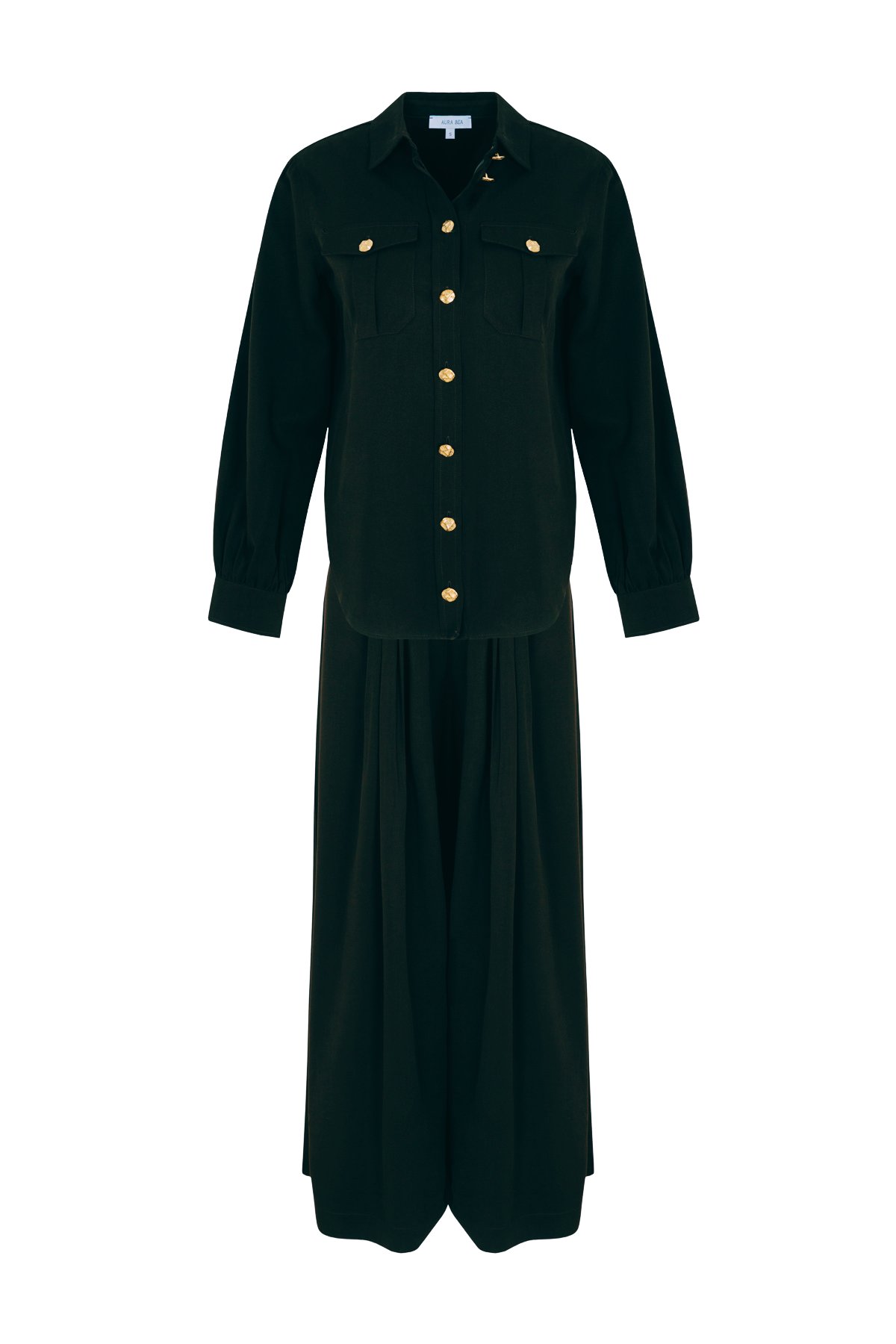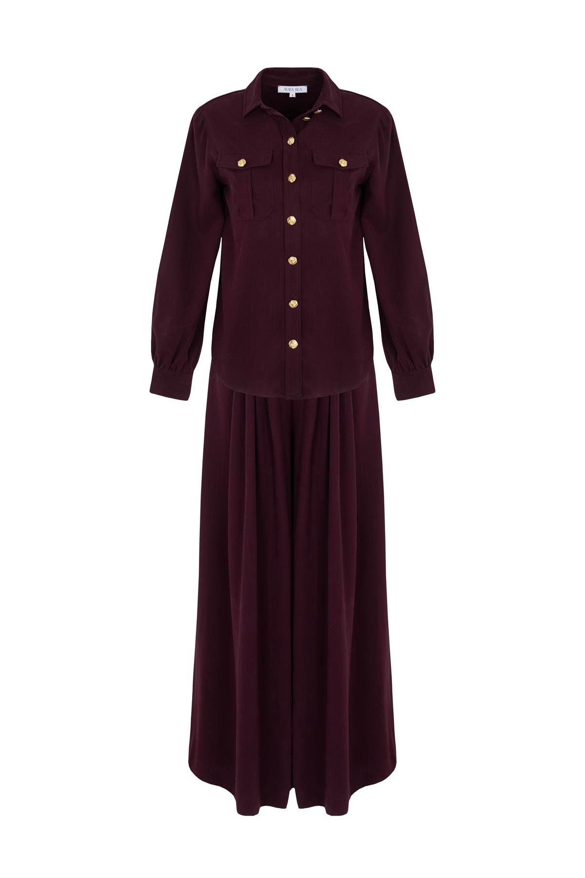 Two-piece set featuring an oversized shirt and wide-leg palazzo trousers. The shirt includes pocket, cuff, and gold button details; the trousers are high-waist with front and back pleats and a relaxed wide silhouette.