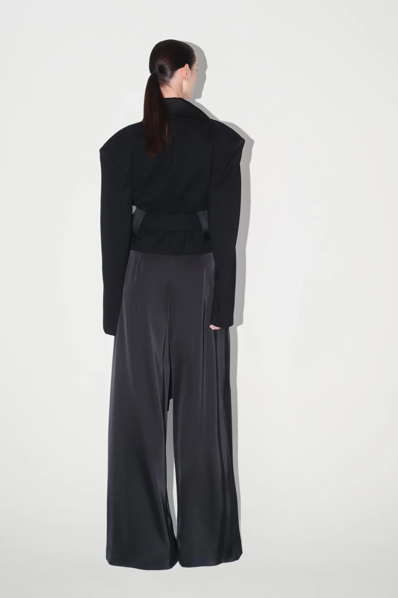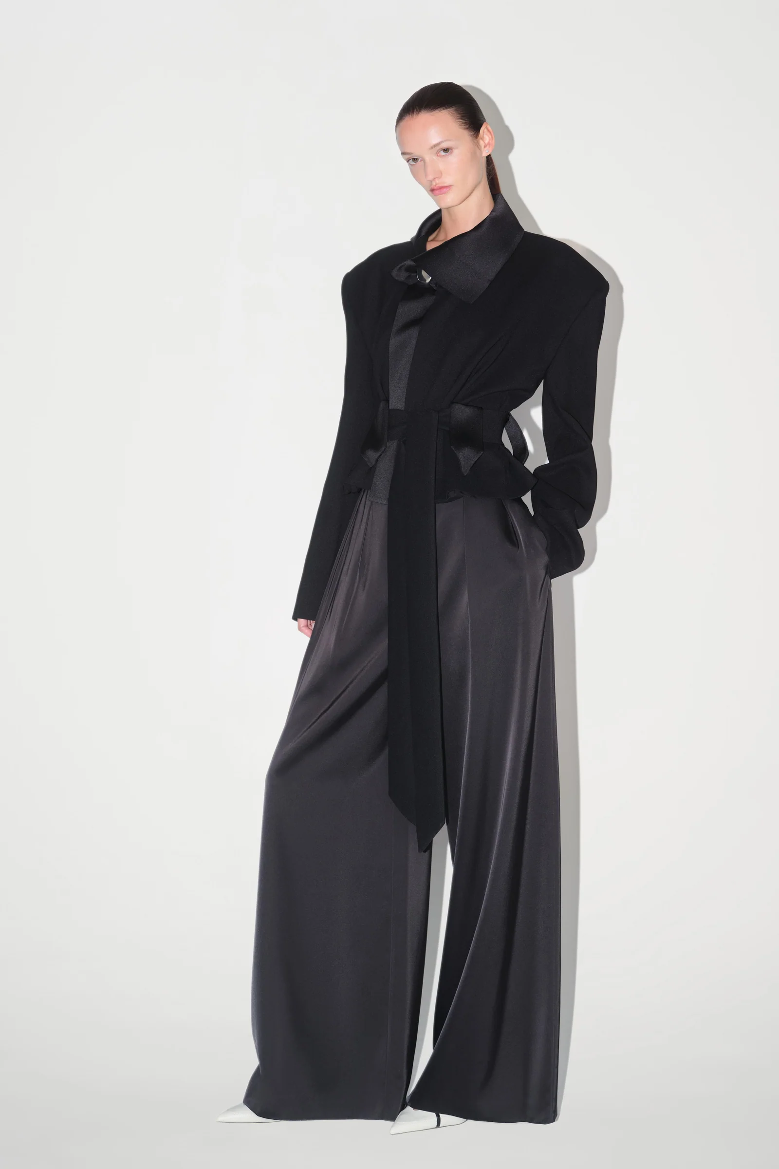 The Twilight Jacket blends soft structure with relaxed tailoring, featuring dropped shoulders, a silver neck closure, and an optional waist tie for adaptable styling.