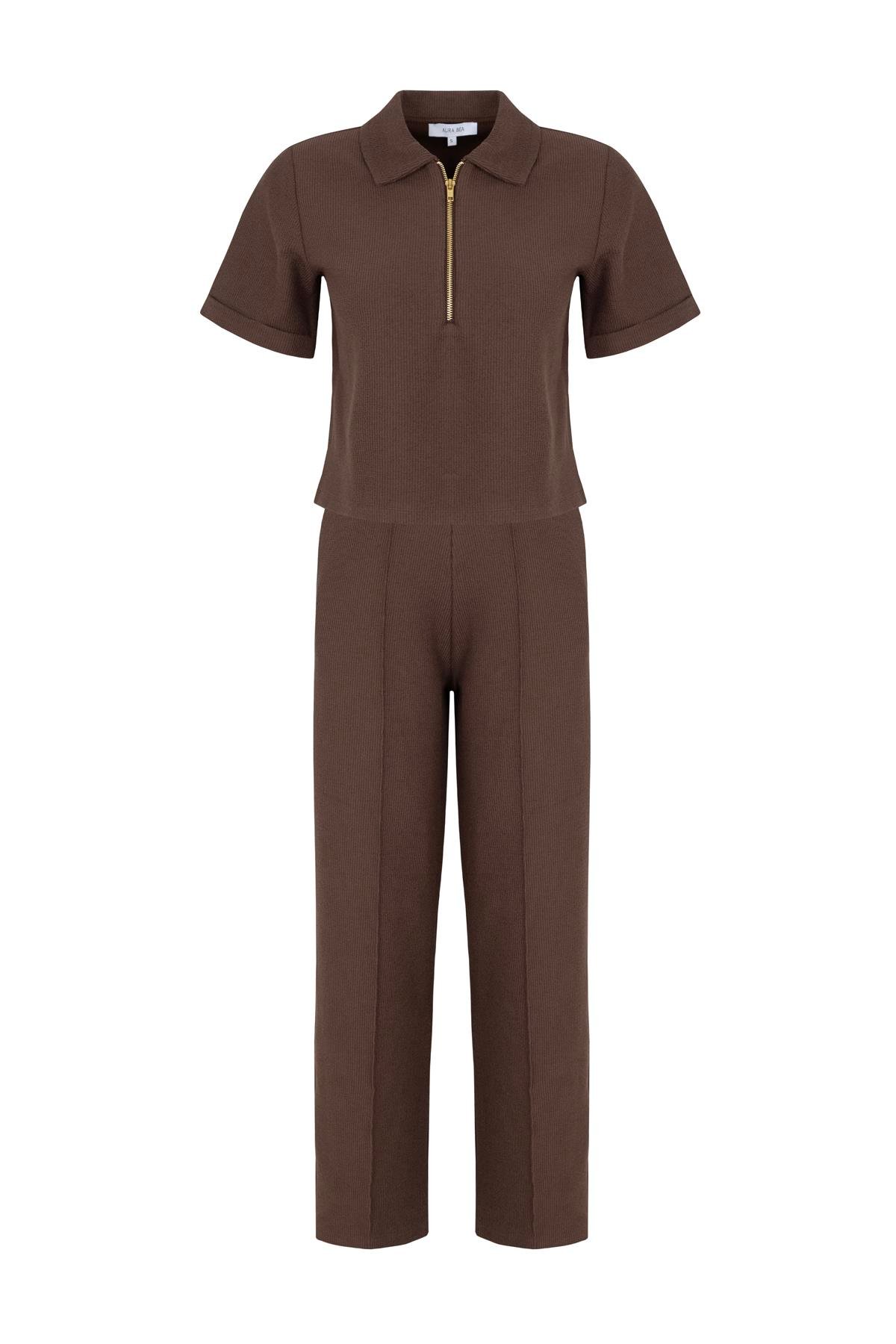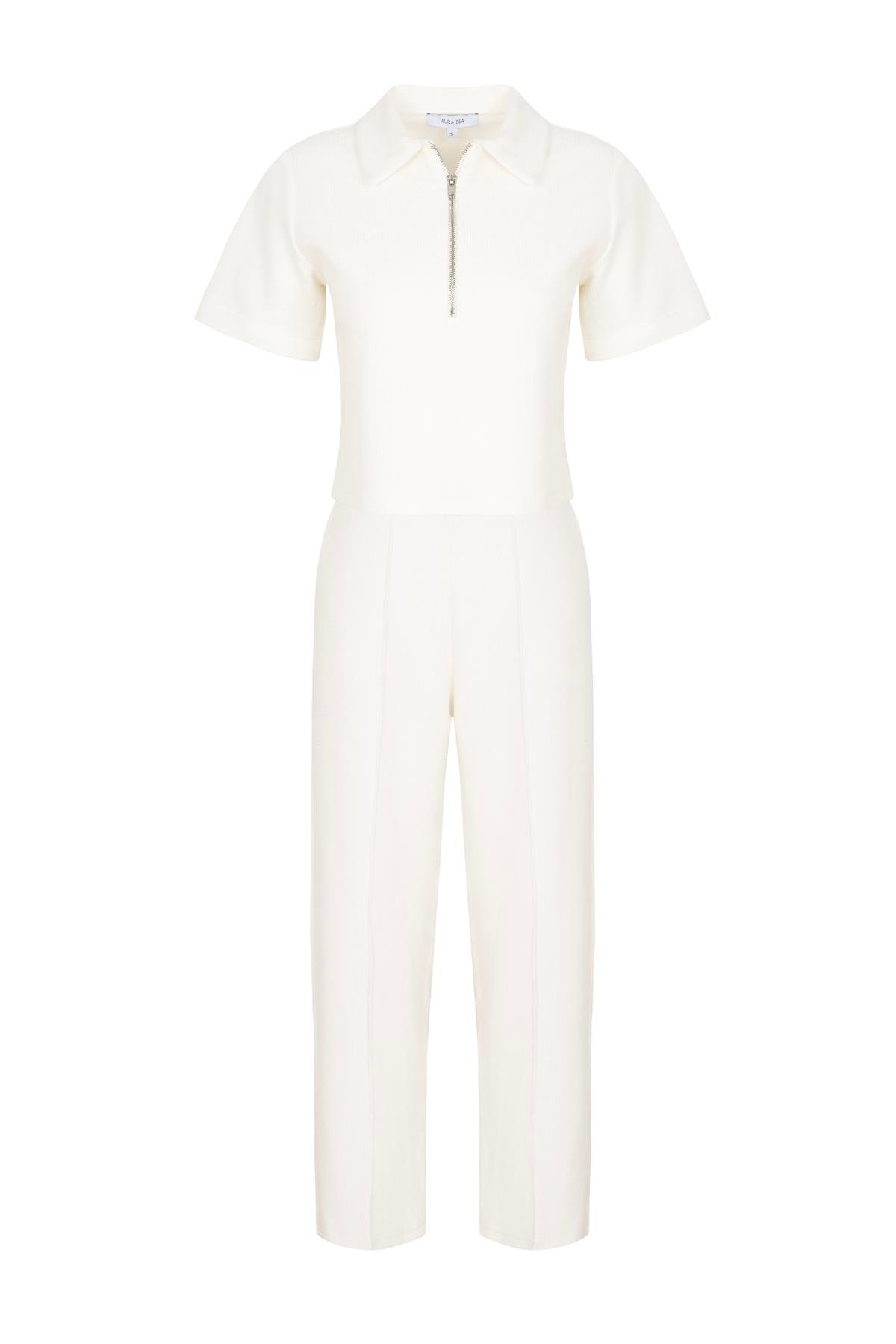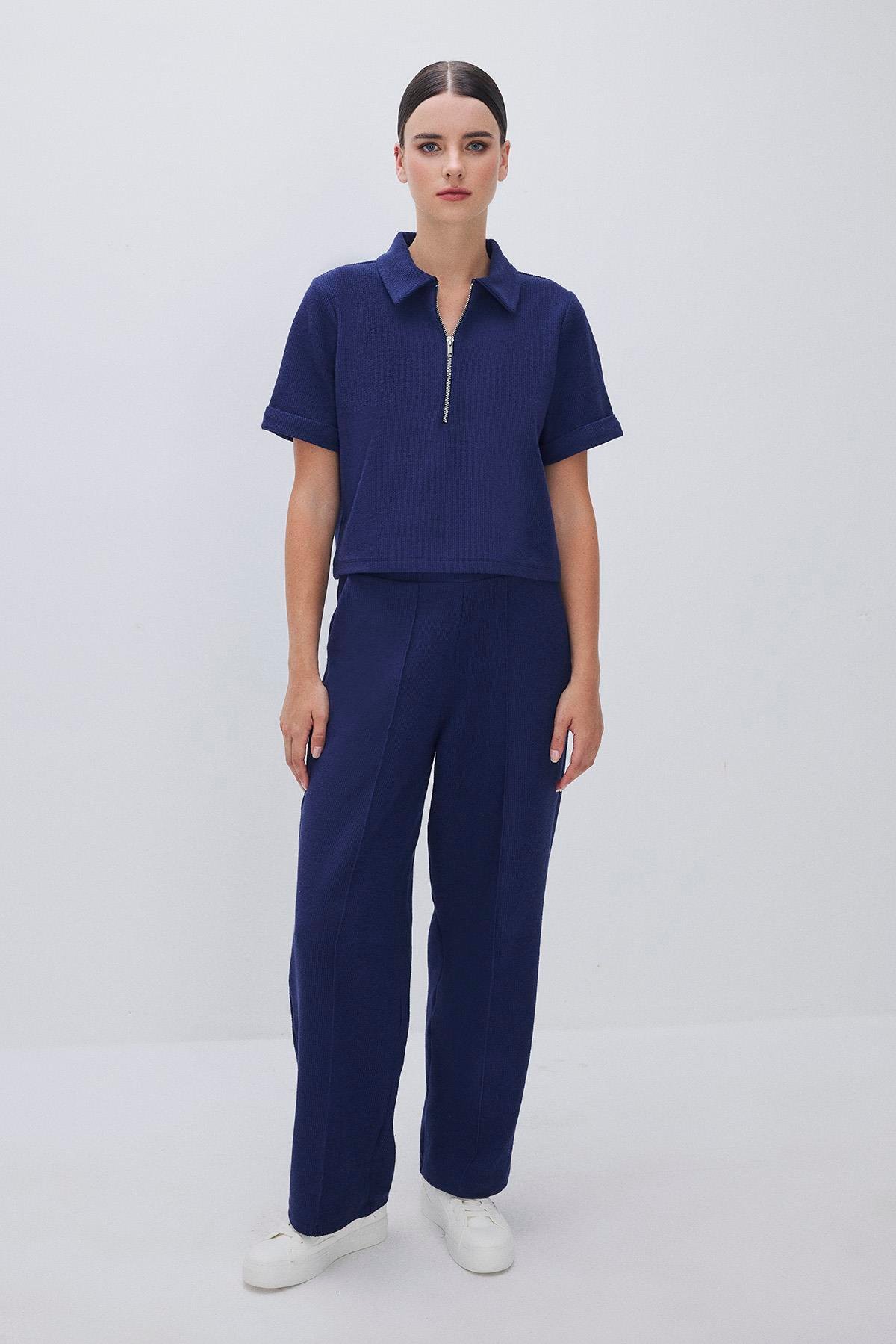 Combining comfort and style, this set includes a short-sleeve zip-up sweatshirt and wide-leg pants for all-day ease.
