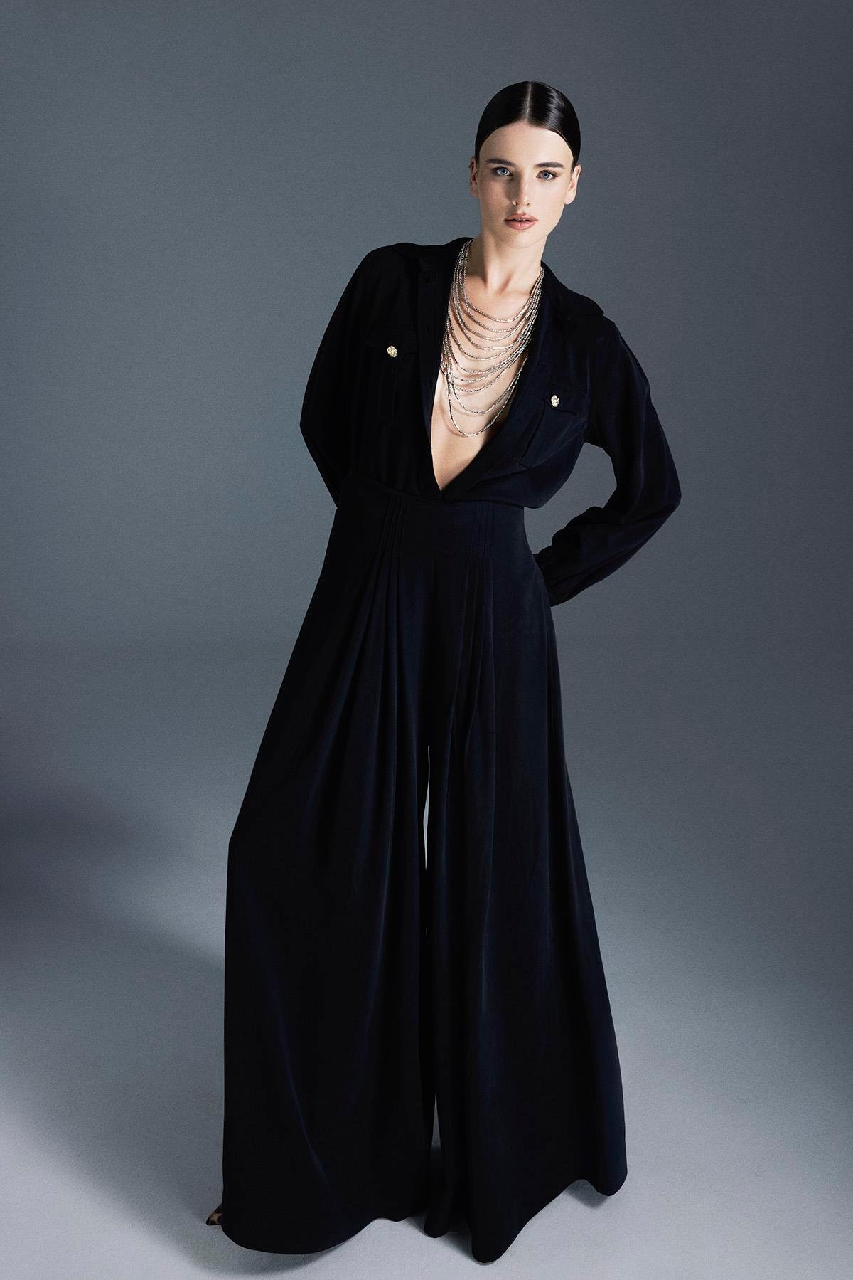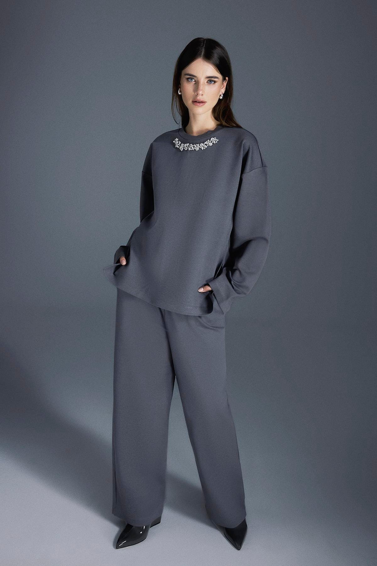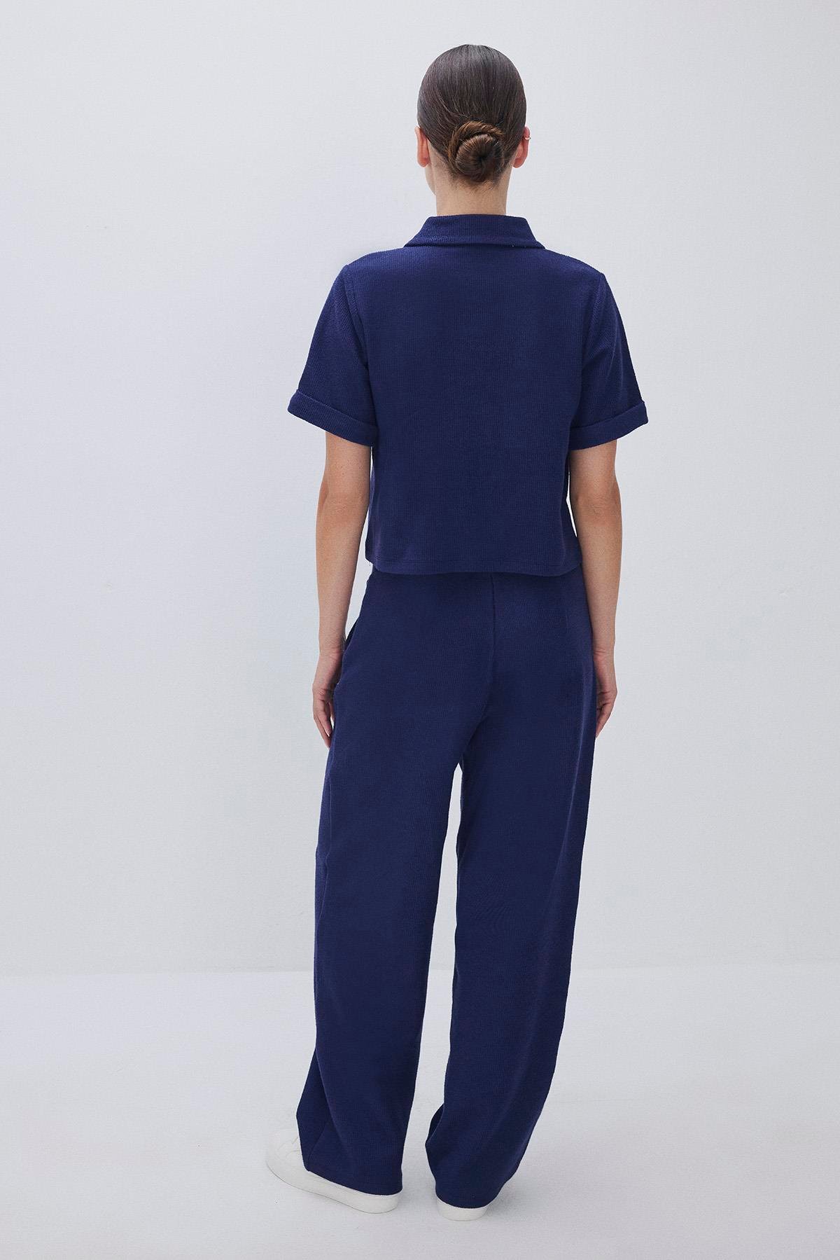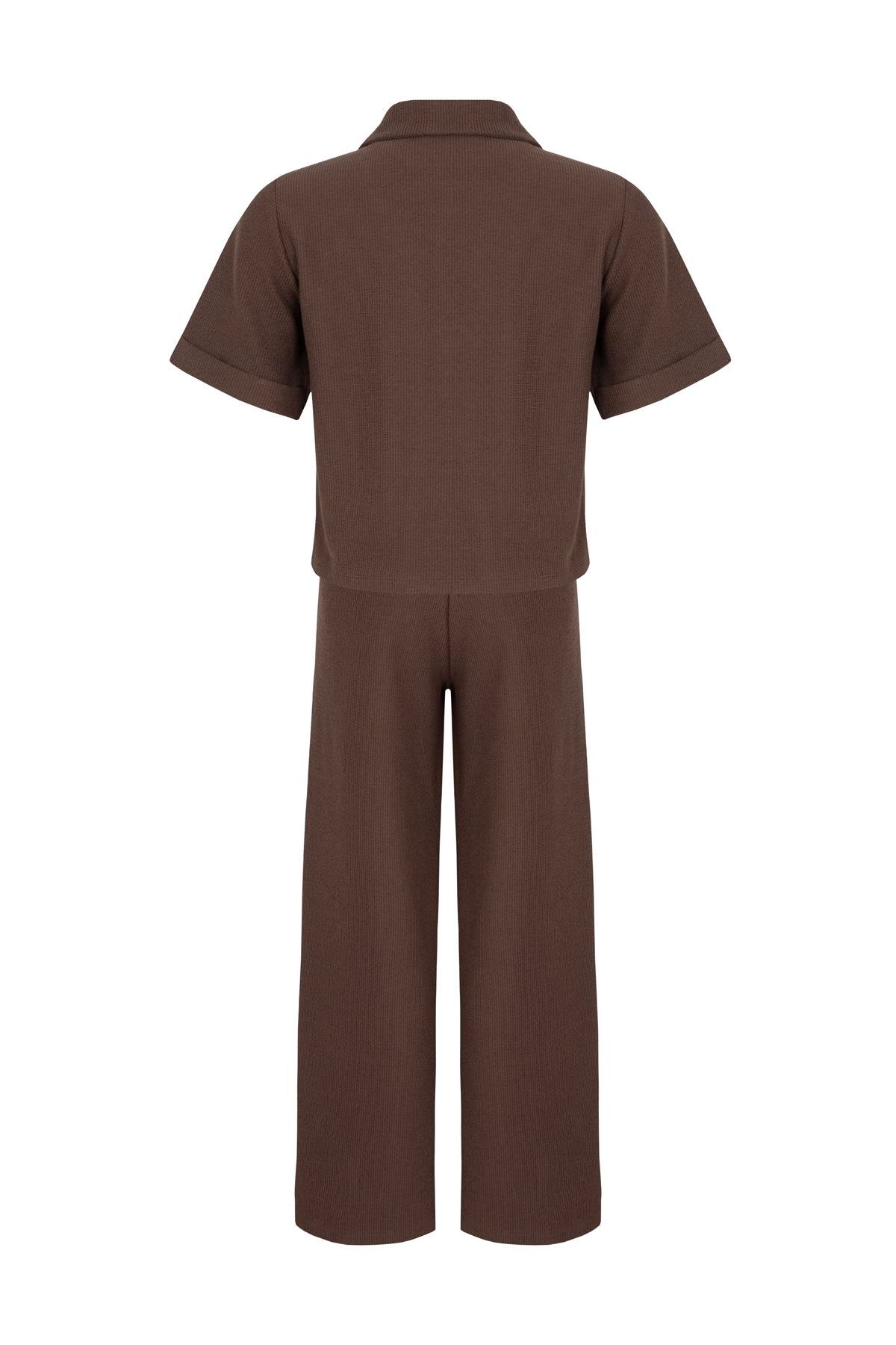 Combining comfort and style, this set includes a short-sleeve zip-up sweatshirt and wide-leg pants for all-day ease.